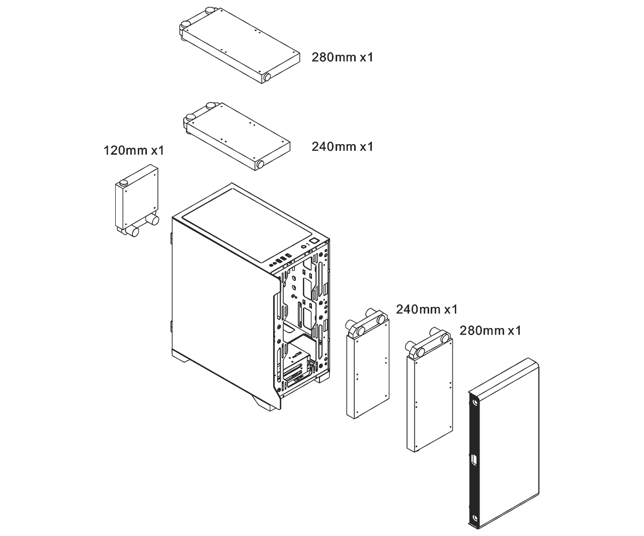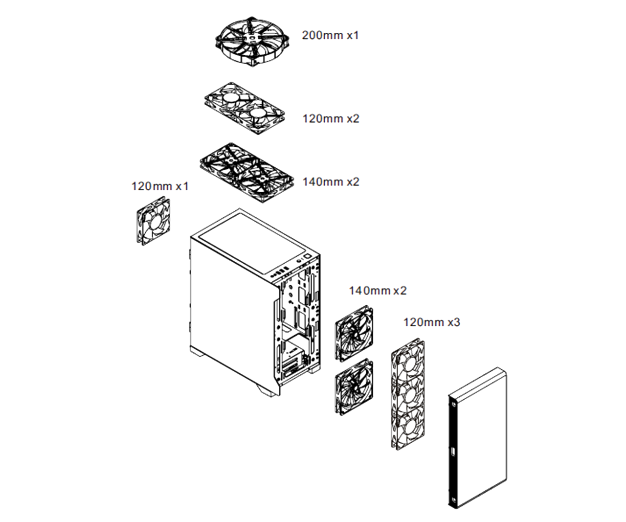 | Fan Support | Front: 3 x 120mm, 2 x 140mm Top: 2 x 120mm, 2 x 140mm, 1 x 200mm Rear: 1 x 120mm, |