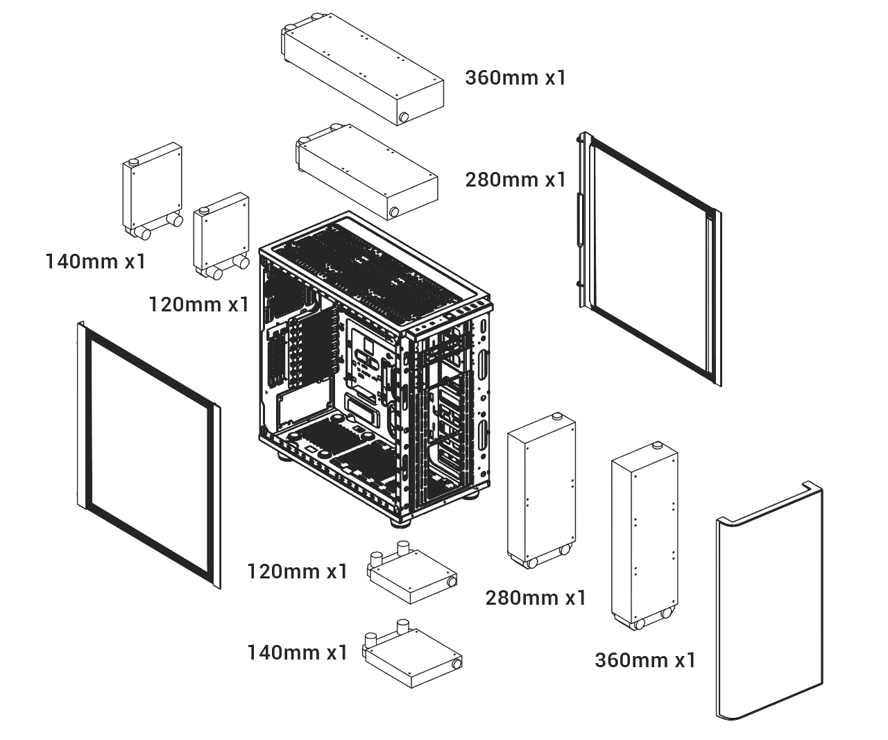 | Radiator Support | Front: 1 x 360mm , 1 x 280mm Top: 1 x 360mm , 1 x 280mm Rear: 1 x 120mm , 1 x 140mm Bottom: 1 x 120mm , 1 x 140mm |