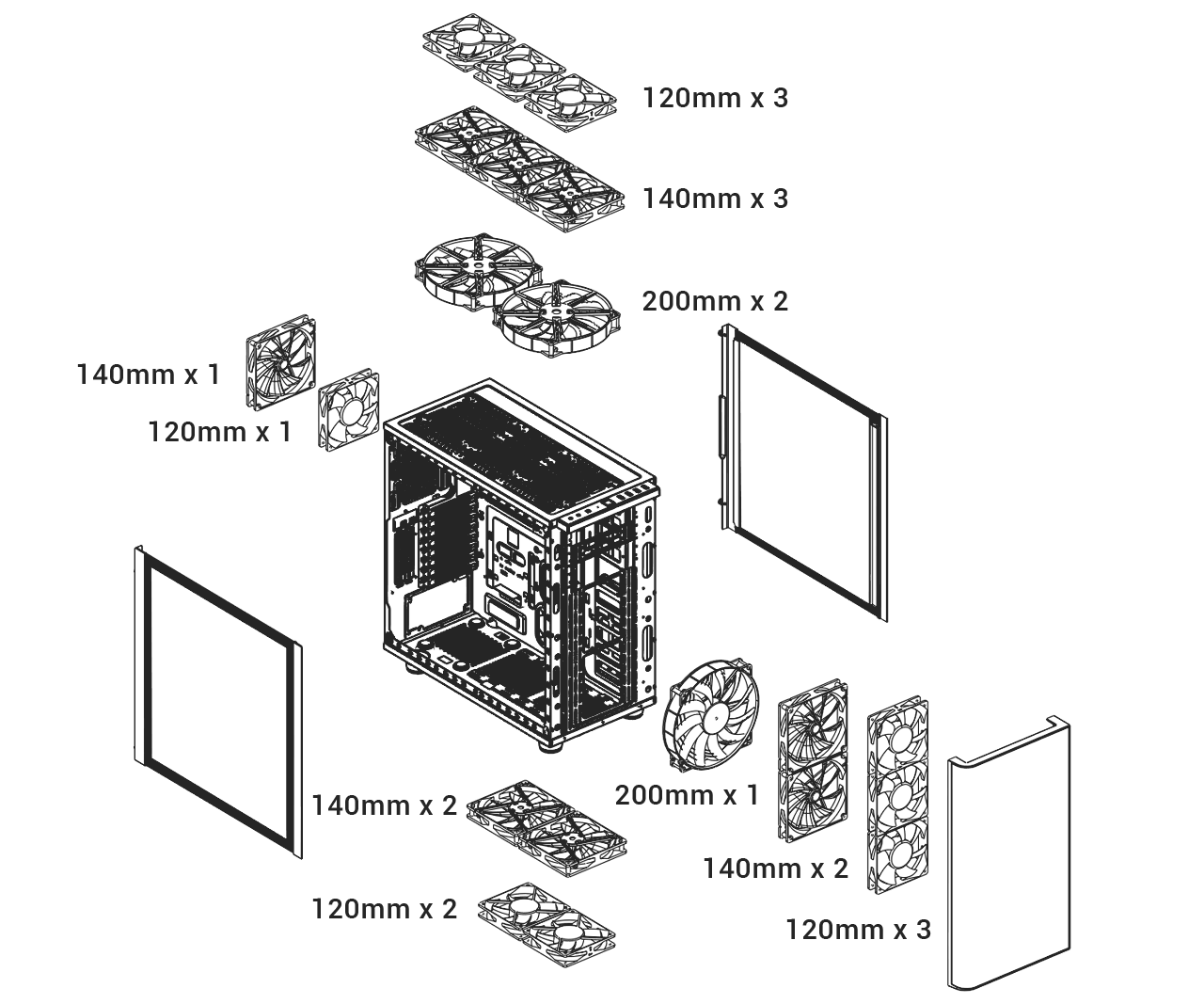 | Fan Support | Front: 3 x 120mm , 2 x 140mm , 1 x 200mm Top: 3 x 120mm , 3 x 140mm , 2 x 200mm Rear: 1 x 120mm , 1 x 140mm Bottom: 2 x 120mm , 2 x 140mm |